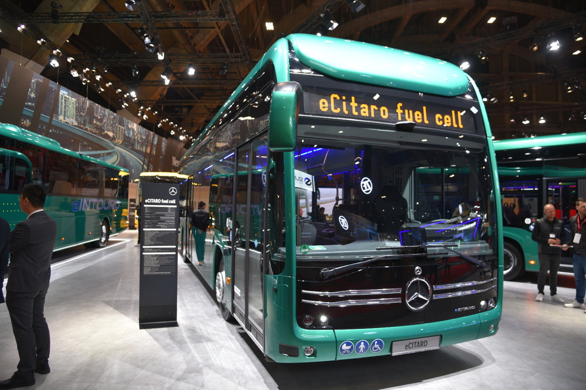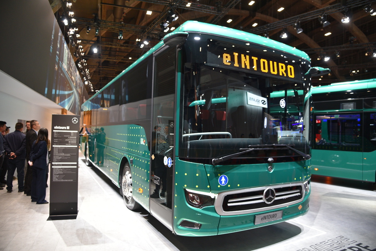 Pod znamko Mercedes-Benz so v Belgiji širši javnosti prvič prikazali električni linijski model eIntouro. Na voljo sta dve dolžini: eIntouro z dolžino 12,18 metra in eIntouro M z dolžino 13,09 metra, potniška kapaciteta tako sega od 50 do največ 63 sedežev. Do dva baterijska sklopa z največjo kapaciteto do 414 kWh omogočata doseg do 500 kilometrov brez vmesnega polnjenja – seveda odvisno od načina vožnje, topografije in vremenskih razmer. Avtobus je že na voljo za naročila, prve dobave pa so predvidene v drugi polovici prihodnjega leta. Na področju brezemisijskih pogonov sta mu družbo delala že znana električni eCitaro ter izvedba z vodikovim podaljševalnikom dosega.