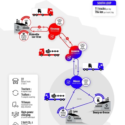 Vse faze so bile zasnovane tako, da se poveča čas uporabe tovornjakov (do 18 ur na dan) in da vozniki ostanejo v bližini svojega doma, zaradi česar je delo bolj privlačno. Z uvedbo 100-odstotno električnega sistema za ta ključni dobavni tok je Renault Trucks dokazal zanesljivost in zrelost svoje električne ponudbe ter hkrati dosegel letni prihranek 2.869 ton CO₂.