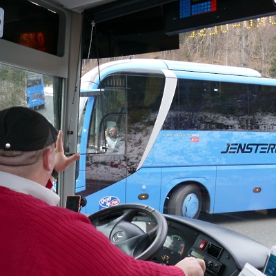Dobro je, če cesto na Jezersko poznaš. Kadar sta za volani avtobusov dva izkušena voznika, se imata med srečevanjem čas še pozdraviti.