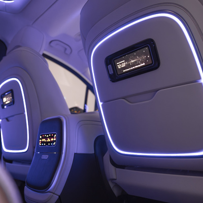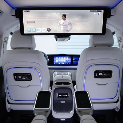V stropnem oblazinjenju nad sprednjima sedežema se skriva zložljiv 79-centimetrski (31,3-palčni) panoramski zaslon z ločljivostjo 8K, funkcijo deljenega zaslona in 8 MP kamero – idealno za uživanje v filmih, glasbenih videoposnetkih in igrah ali za udeležbo na videokonferencah.