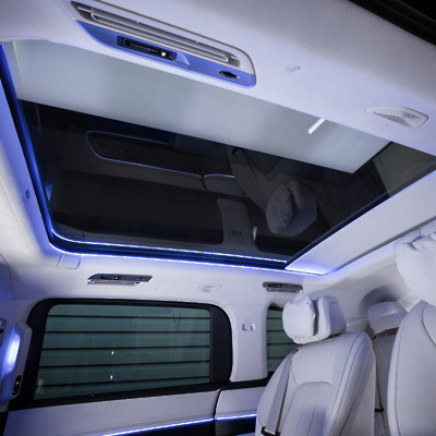 Impresivna steklena streha prinaša doslej neviden občutek prostora in svobode ter miru. Ambientalna osvetlitev notranjosti to poudarja na poseben način. Preprosto se sprostite in uživajte. Električni senčni rolo ščiti pred prekomerno sončno svetlobo.