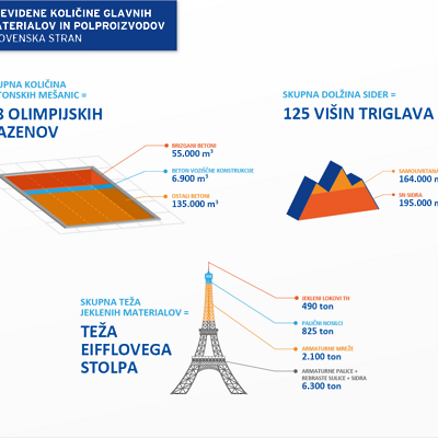 Ker gradnja druge cevi predora Karavanke nedvomno spada med večje slovenske gradbene projekte, je treba zapisati še nekaj zanimivih podatkov. Skupaj so v našem delu cevi izkopali za 171 olimpijskih bazenov gradbenega materiala, skupna količina betonskih mešanic bi zapolnila 78 olimpijskih bazenov, od tega bi malo manj kot tri 'bazene' zasedel beton voziščne konstrukcije. Skupna teža jeklenih materialov je podobna masi Eifflovega stolpa, kar pomeni, da je v predor vgrajenih 490 ton jeklenih lokov, 825 ton paličnih nosilcev, 2.100 ton armaturne mreže in 6.300 ton armaturnih palic z drugimi elementi. Celotna struktura kajpak potrebuje še sidra, teh bo skupaj za 125 višin Triglava, natančneje 359 kilometrov.